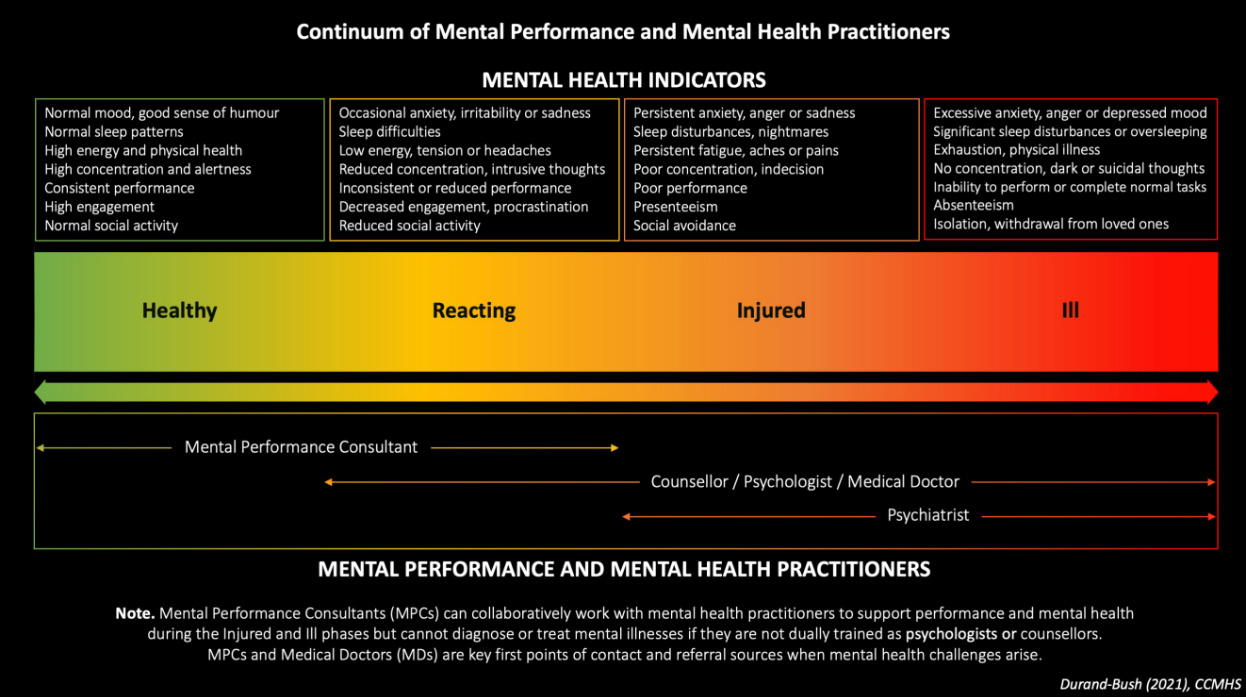 Services may include a Mental Performance Consultant (MPC), Registered Counsellor or Psychotherapist, or Licensed Clinical Psychologist. Recommendations should be made according to the severity of the symptoms of the athlete. See figure 1 below for help selecting an appropriate service for the athlete.